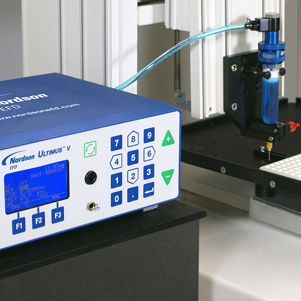 Med dispenseren Ultimus V fra EFD opnås et nyt præcisionsniveau og ensartethed i forbindelse med dispensering af væske, der ændrer viskositet, f.eks. to-komponent epoxy og andre væsker, der fortykkes over tid, samt UV-lim og væsker, der bliver tyndere, når den omgivende temperatur stiger.