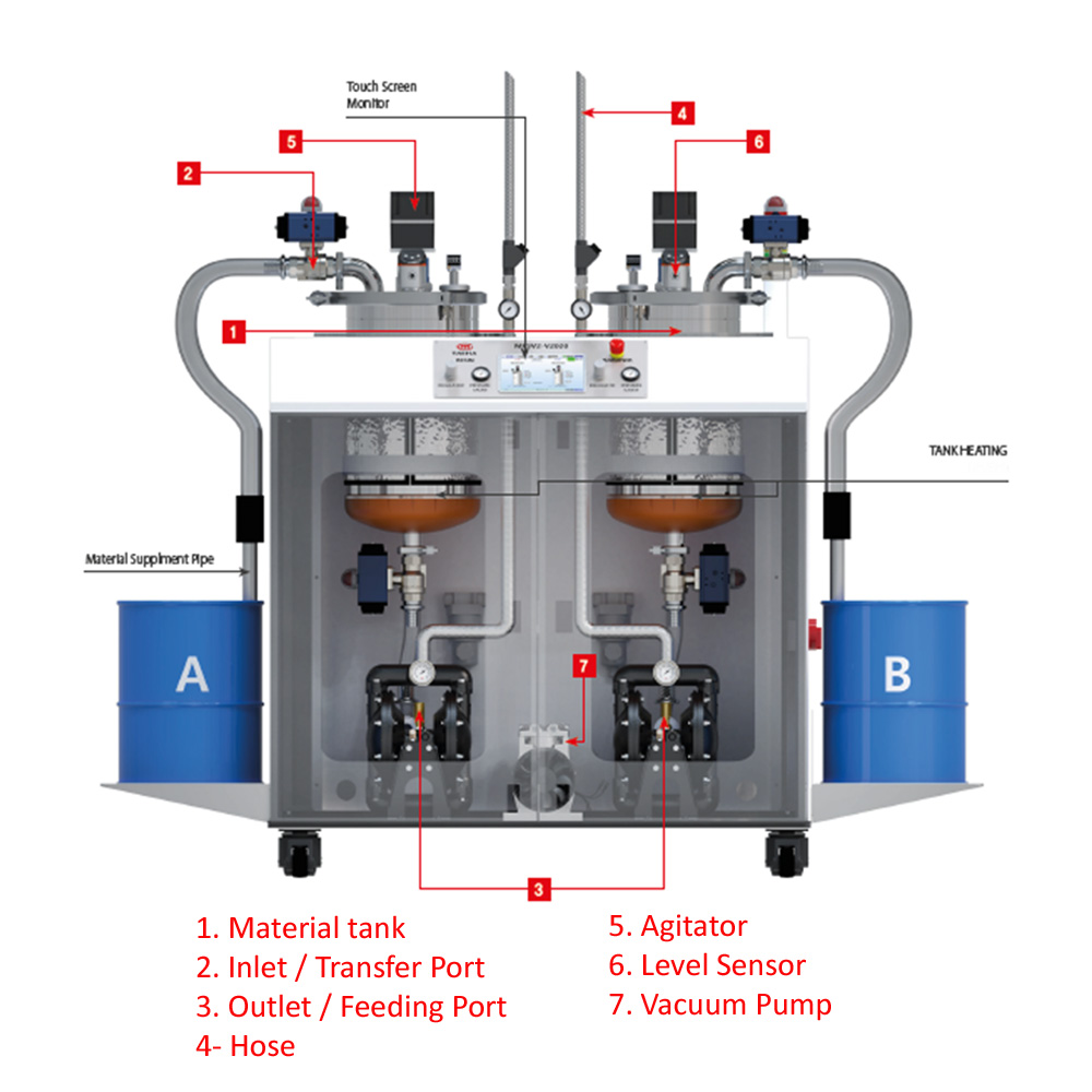 Brugerne har mulighed for at tilpasse vakuum-afgasningstiden, forvarmningsfunktionen og omrøringsfunktionen baseret på materialegenskaberne. En integreret vakuumpumpe holder tankene i konstant vakuumtilstand, hvilket forhindrer hærdningsproblemer på grund af fugt og eliminerer behovet for tankrengøring eller separat afgasningsproces.