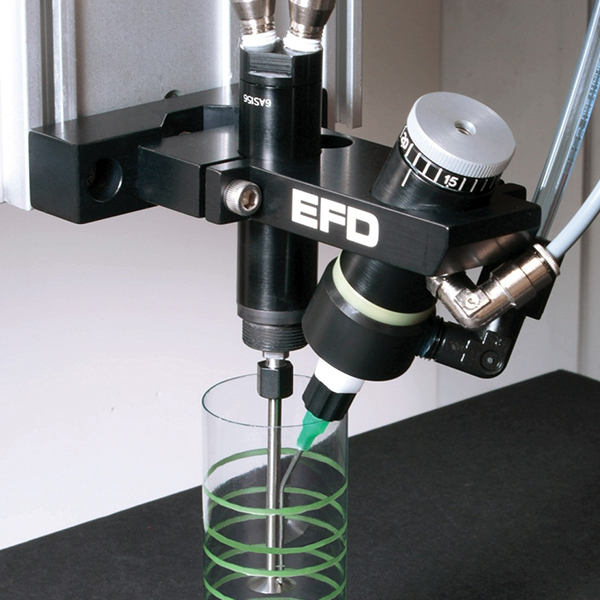 EFD ventilsystemet består af en kompakt, luftdrevet motor, en lavvedligeholdelses dispenserventil og en ValveMate kontrolenhed. Ventilen fordeler en præcis målt mængde af væske ned på roterende plade, som er sat på motoren. Når væsken når til kanten af pladen, så roterer det af pladen og danner et pænt bånd indeni delen.