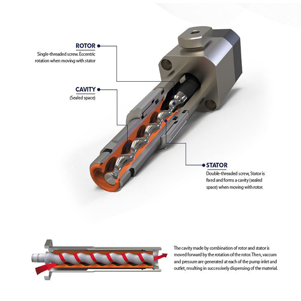 Pro-pump 1K doseringssystem består af en excentrisk skruepumpe (PCP) og en pulse controller (Procon-100/ Procon-1.000). Pro-pump doseringssystemet er et roterende, tryktæt, positivt forskydningssystem med selvforseglende rotor-stator design. Rotorens kontrollerede, roterende bevægelse overfører mediet ved forskydning i statoren. Mediet forbliver uændret ved denne proces. Og ved at skifte til reverse-flow (tilbagesug) sikres et rent og kontrolleret stop af doseringen af materialet.