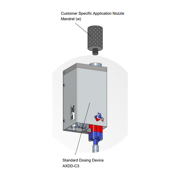 Denne doseringsenhed garanterer den korteste leverings-, opsætnings- og idrifttagningstid, da kun den kundespecifikke applikationsdyse (dorn eller rede) skal tilpasses din originale komponent.
