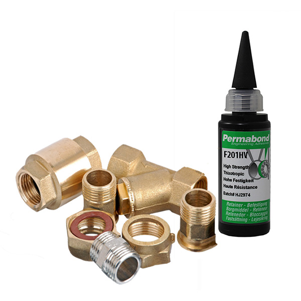 Permabond F201HV kan anvendes til metalrørsamlinger med gevind eller på koncentriske metaldele med slidspasning. I modsætning til konventionelle anaerobe gevindtætningsmidler, bliver Permabond F201HV ikke skør, da den absorberer vibrationer og stød uden at revne. Dette muliggør tætning af uens metaller, såsom messing til kobber, da den klæbende tætningsmasse vil absorbere differentiel termisk udvidelse og kontraktionsspænding. Derudover kan limens høje styrke og permanente tætningsevne forhindre manipulation, utilsigtet beskadigelse og løsnede samlinger, som kan resultere i brintlækage.