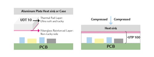 DiaTherm™ pads fås i forskellige hårdheder, tykkelser og med forskellige varmeledende egenskaber. De er fremstillet af silikone, som giver en klæbende overflade og er derfor lettere at montere end andre varmeledende pads. Valget faldt på DiaTherm™ UDT-serien, som er ”tør” og glasfiberforstærket på den ene side og blød og klæbende på den anden side.