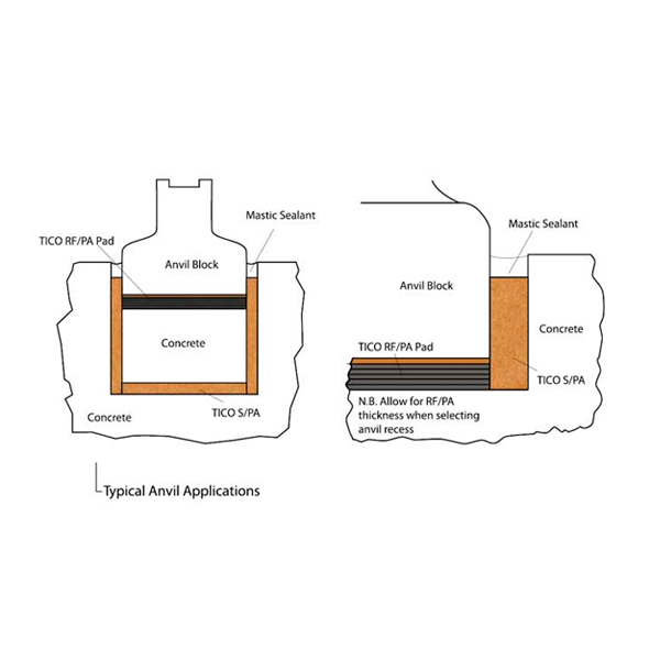 TICO RF/PA Hi Duty antivibrationsplader anvendes eksempelvis til slaghammerambolte, samt til rørstøtter og isolering ved olie- & gasindustrien.